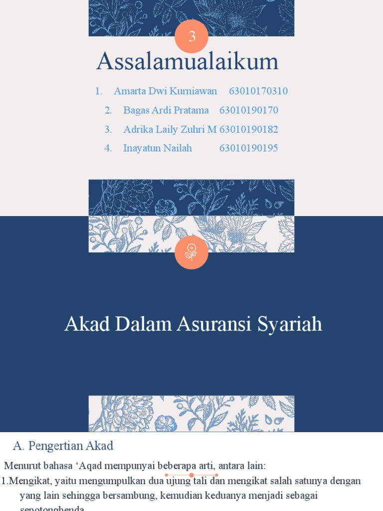 ASURANSI SYARIAH · 1. Akad Tabarru' (Hibah / Tolong Menolong) · 2. Akad Tijarah (Mudharabah). Dalam akad ini perusahaan asuransi sebagai mudharib (Pengelola), dan ... Sep 10, 2016 · Akad-akad perjanjian merupakan salah satu perbedaan yang mendasar antar asuransi syariah dengan asuransi konvensional. Akad dalam transaksi merupakan suatu hal yang utama, sehingga apanila suatu transaksi dilakukan tanpa didasari dengan akad yang jelas maka transaksi tersebut dapat dianggap meragukan atau berbahaya. Akad-Akad di dalam Asuransi Syariah Junaidi Abdullah Institut Agama Islam Negeri Kudus joen3d1@yahoo.com Abstract Human life is full of risks. There is a risk of loss, accident and even the risk of death. To prepare for these risks, a sense of security is needed through coverage. These coverage is through Islamic insurance.