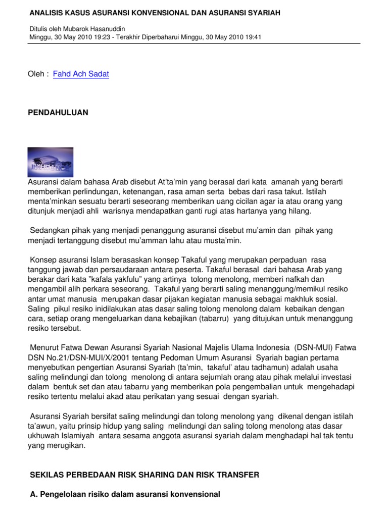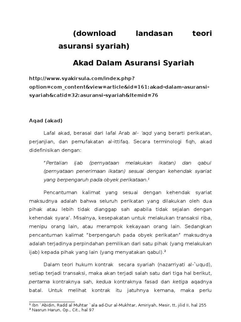 Sep 27, 2015 · Sifat Akad dalam Asuransi Syariah Hubungan sesama peserta asuransi Untuk memenuhi prinsip saling tolong menolong Risk Sharing (Bagi Risiko) Akad bersifat Tabarru’ Hubungan antara peserta asuransi dengan perusahaan asuransi Untuk melaksanakan fungsi operasi perusahaan asuransi Akad bersifat Tijarah. 23. by HT Yanggo · 2017 — KONSEP AKAD PADA ASURANSI SYARIAH. Studi Pengelolaan Dana dan Resiko Pada PT Asuransi Takaful Keluarga. Dalam Persfektif Hukum Islam.69 pages