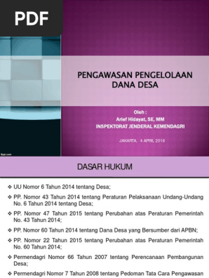 Peraturan Pemerintah Nomor 60 Tahun 2014 tentang Dana Desa yang Bersumber dari Anggaran Pendapatan dan Belanja Negara (Lembaran Negara Republik Indonesia Tahun 2014 Nomor 168, Tambahan Lembaran Negara Republik Indonesia Nomor 5558) sebagaimana telah diubah terakhir dengan Peraturan Pemerintah Nomor 8 Tahun 2016 (Lembaran Negara Republik ... Dalam hal ini, sudah beberapa tahun terakhir, Pemerintah Pusat menggelontorkan dana yang besar kepada desa. Dengan besarnya nominal, Pemerintah Pusat pastinya akan melakukan pengawasan supaya tidak ada penyelewengan dana.Untuk membantu pengawasan maka dicetuskanlah Permendes PDTT No 21 Tahun 2020. by R Ghozali · 2018 · Cited by 1 — PENGELOLAAN DANA DESA DENGAN PENDEKATAN GOOD GOVERNANCE (STUDI KASUS PADA 19 DESA ... 2014. Peraturan pemerintah Nomor 60 Tahun 2014 tentang Dana Desa yang ...