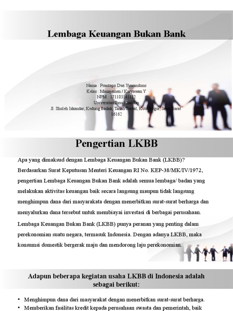 Pengertian Lembaga Keuangan Bukan Bank. Apa yang dimaksud dengan Lembaga Keuangan Bukan Bank (LKBB)?? Berdasarkan Surat Keputusan Menteri Keuangan RI No. KEP-38/MK/IV/1972, pengertian Lembaga Keuangan Bukan Bank adalah semua lembaga/ badan yang melakukan aktivitas keuangan baik secara langsung maupun tidak langsung menghimpun dana dari masyarakata dengan menerbitkan surat-surat berharga dan ...