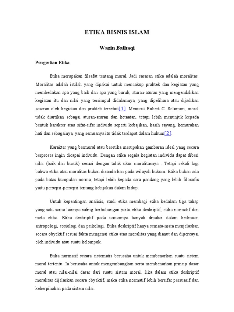 Etika bisnis adalah cara yang kamu lakukan dalam berbisnis meliputi semua kegiatan bisnis yang berhubungan dengan perusahaan, masyarakat, maupun individu. 16 Apr 2021 — Menurut Muslich, etika bisnis adalah suatu pengetahuan tentang tata cara ideal pengaturan dan pengelolaan bisnis yang memperhatikan norma dan ... 11 Nov 2021 — Etika bisnis adalah segala sesuatu tentang pedoman norma bagi sebuah perusahaan dalam mengambil keputusan. Dengan terjaganya hubungan baik ...