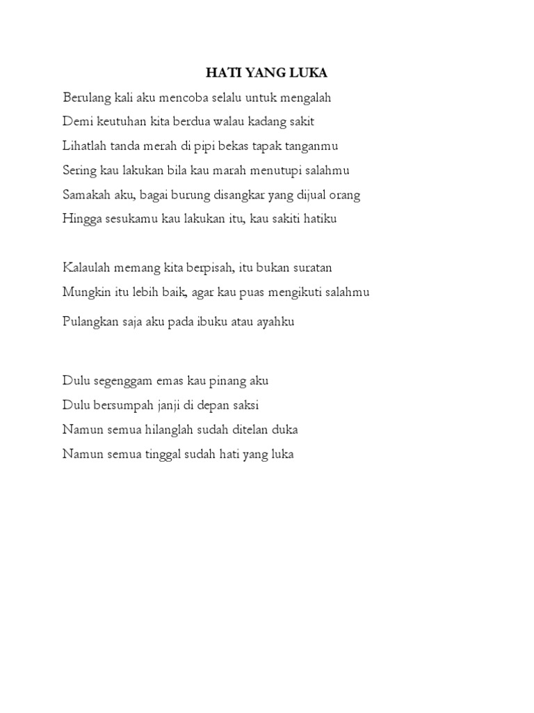 Baca juga: Chord Hati yang Luka - Betharia Sonata Dimainkan dari Kunci G: Dulu Segenggam Emas Kau Pinang Aku. Baca juga: Chord Gitar Seharusnya Aku - Elsa Pitaloka: Kekasih di Mana Kurangnya Aku ... agar kau puas membagi cinta. Pulangkan saja. aku pada ibuku atau ayahku… Dulu, segenggam emas. kau pinang aku… Dulu, bersumpah janji. didepan saksi wow wow… Namun semua hilanglah sudah. ditelan dusta wow wow… Namun semua tinggal cerita. hati yang luka… Namun semua tinggal cerita. hati yang luka…