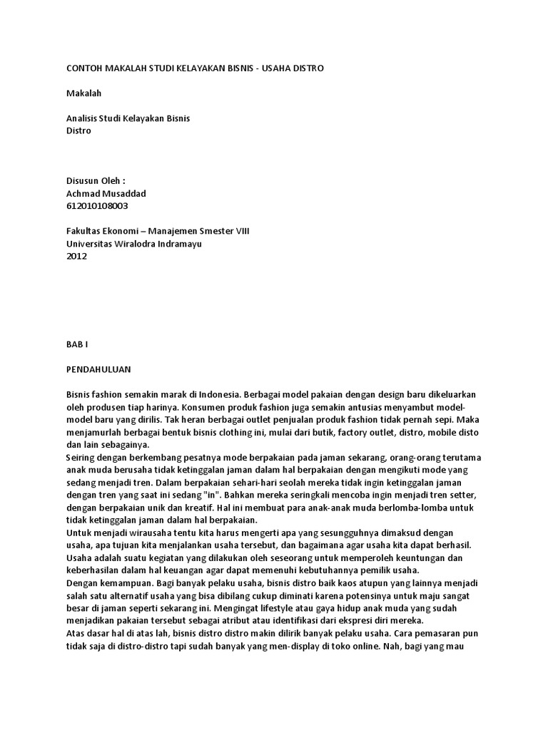Contoh makalah Studi Kelayakan Bisnis - Usaha Fashion Makalah. Analisis Studi Kelayakan Bisnis. Fashion. Disusun Oleh : Achmad Musaddad. 612010108003. Fakultas Ekonomi - Manajemen Smester VIII. Universitas Wiralodra Indramayu. 2012. BAB I. PENDAHULUAN.