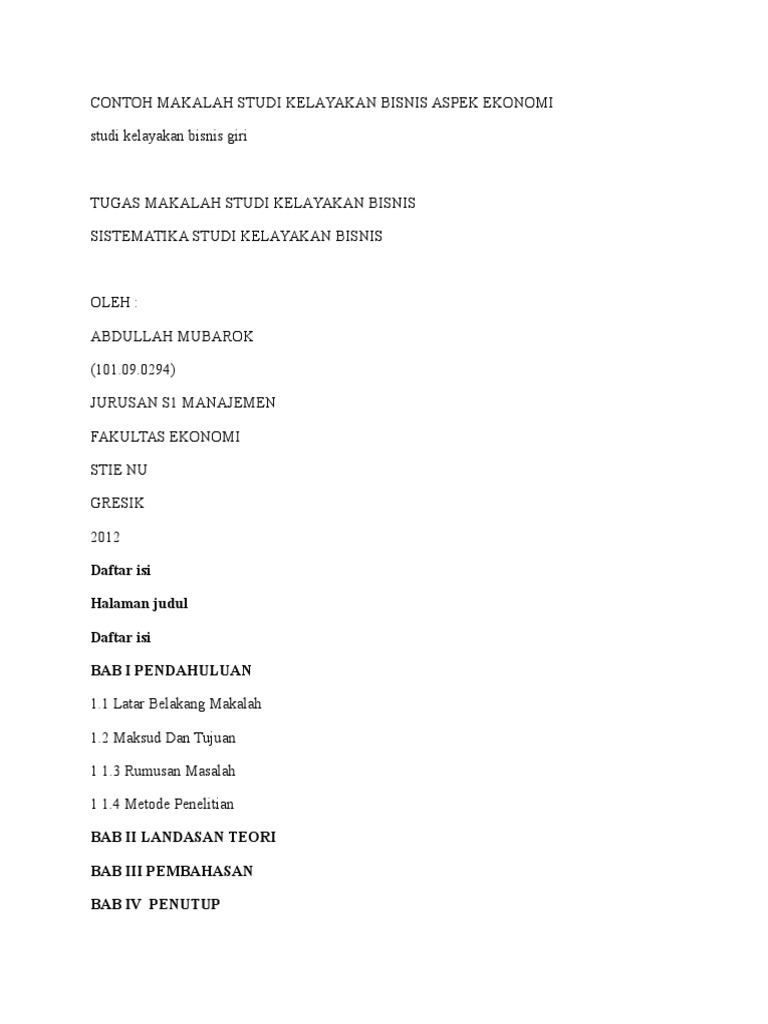 Download CONTOH MAKALAH STUDI KELAYAKAN BISNIS PDF. Title, CONTOH MAKALAH STUDI KELAYAKAN BISNIS. Region. Format, PDF. Pages, 4. File Size, 111.5 KB.