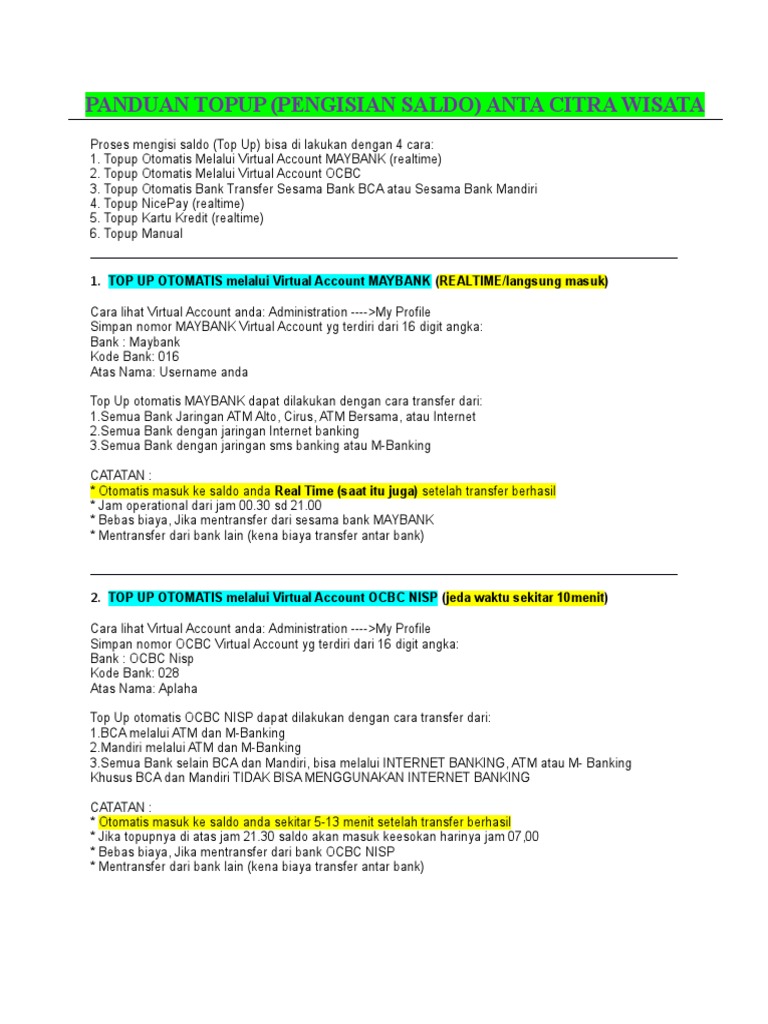 Cara pengecekannya pun bervariasi, mulai dari pengecekan ke bank (pencetakan buku tabungan ataupun rekening koran), melalui mesin Anjungan Tunai Mandiri (ATM), mobile banking, internet banking, ataupun sms banking... Dengan adanya fitur transfer, virtual account billing, maupun multi payment berbagai merchant saat ini telah... Tentang Cara Kerja Fitur Biaya Developer... rekening bank dalam 1 dashboard. Support BCA, Mandiri, BNI, BRI... Untuk top up dengan bank lainnya, seperti Bank BRI, Mandiri, BTN, Panin dan OCBC, Anda dapat melakukan top up dengan cara transfer ke nomor virtual account Bank BNI. Transaksi dengan cara ini, Anda akan dikenakan biaya administrasi transfer antar-bank, dengan biaya yang berbeda-beda. Sekitar Rp.6.500 hingga Rp.7.500. 5.