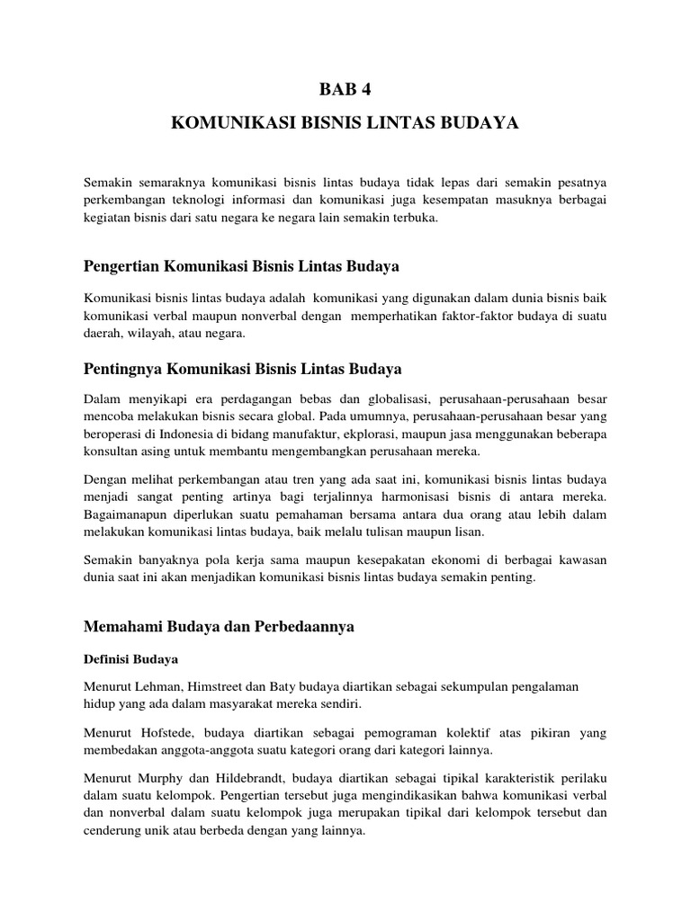 MAKALAH_KOMUNIKASI_BISNIS LINTAS BUDAYA.docx - MAKALAH ... BAB II ISI 2.1 Pengertian Komunikasi Bisnis Lintas Budaya. Bagi para pelaku bisnis, pemahaman yang baik terhadap budaya di suatu daerah, wilayah, atau negara menjadi sangat penting artinya bagi pencapaian tujuan organisasi bisnis. Secara sederhana, komunikasi bisnis lintas budaya adalah komunikasi yang digunakan dalam dunia bisnis baik komunikasi verbal maupun nonverbal dengan memperhatikan ...