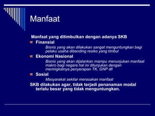 Studi Kelayakan Bisnis : Pengertian, Tujuan dan Manfaat Manfaat Studi Kelayakan Bisnis Berikut adalah beberapa tujuan lain alias Manfaat dari SKB, 1. Dalam Segi Finansial Artinya, bisnis tersebut dirasa sangat menguntungkan bagi pelaku bisnis sendiri, apabila bisnis tersebut dibandingkan dengan resiko yang akan ditanggung.