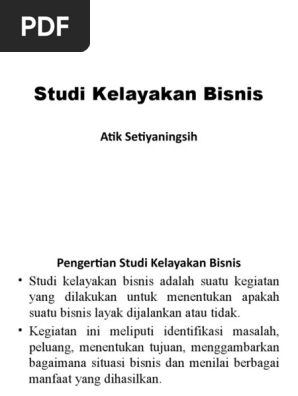 Studi Kelayakan Bisnis: Pengertian, Aspek, Tujuan dan ... Studi kelayakan bisnis adalah suatu kegiatan yang dilakukan untuk menentukan apakah suatu bisnis layak dijalankan atau tidak. Kegiatan ini meliputi identifikasi masalah, peluang, menentukan tujuan, menggambarkan bagaimana situasi bisnis dan menilai berbagai manfaat yang dihasilkan. Studi Kelayakan Bisnis, Pelajari Pengertian, Tujuan, dan ... Tujuan Melakukan Studi Kelayakan Bisnis Tujuan utama dari studi kelayakan bisnis adalah untuk menilai peluang proyek bisnis, apakah proyek tersebut layak dilanjutkan atau tidak. Jika memang proyek layak diteruskan, maka bisa ditentukan upaya yang perlu dilakukan untuk melindungi Anda dari risiko rugi. MANFAAT STUDI KELAYAKAN BISNIS (SKB) - Karya Tulis Ilmiah Berikut ini akan dijelaskan manfaat studi kelayakan bisnis (SKB). Seperti diketahui, hasil dari suatu studi kelayakan bisnis adalah laporan tertulis. Isi laporan studi kelayakan bisnis menyatakan bahwa suatu rencana bisnis layak direalisasikan. Tujuan dan Manfaat Studi Kelayakan Bisnis ( SKB ... Tujuan Studi Kelayakan Bisnis 1. Menghindari Resiko Kerugian 2. Mempermudah Perencanaan 3. Mempermudah Pelaksanaan Pekerjaan 4. Mempermudah Pengawasan 5. Mempermudah Pengendalian Tujuan Studi Kelayakan Bisnis Studi kelayakan sebagai sebuah pengetahuan tentu memiliki tujuan yang harus diketahui oleh para pengunanya.