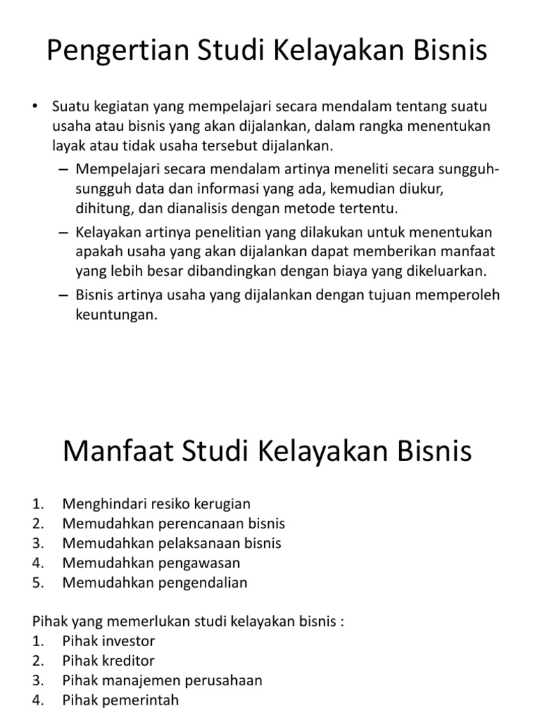 Studi Kelayakan Bisnis: Tujuan dan Manfaatnya - Karinov.co.id Manfaat Studi Kelayakan Bisnis Manfaat dari studi kelayakan bisnis sangat di rasakan oleh berbagai pihak terutama para pihak yang berkepentingan terhadap proyek atau usaha yang akan dijalankan. Hasil penelitian yang dianggap layak harus dapat dipertanggungjawabkan, agar tidak ada pihak yang dirugikan.
