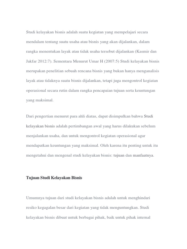(DOC) STUDI KELAYAKAN BISNIS (SKB) DAGANG | Irlannita ... Menurut Yacob Ibrahim (2009), studi kelayakan bisnis adalah kegiatan untuk menilai sejauh mana manfaat yang dapat diperoleh dalam melaksanakan suatu kegiatan usaha/proyek.. Menurut Suliyanto (2010), Kata "bisnis" berasal dari bahasa Inggris "busy" yang artinya "sibuk", sedangkan "business" artinya "kesibukan".