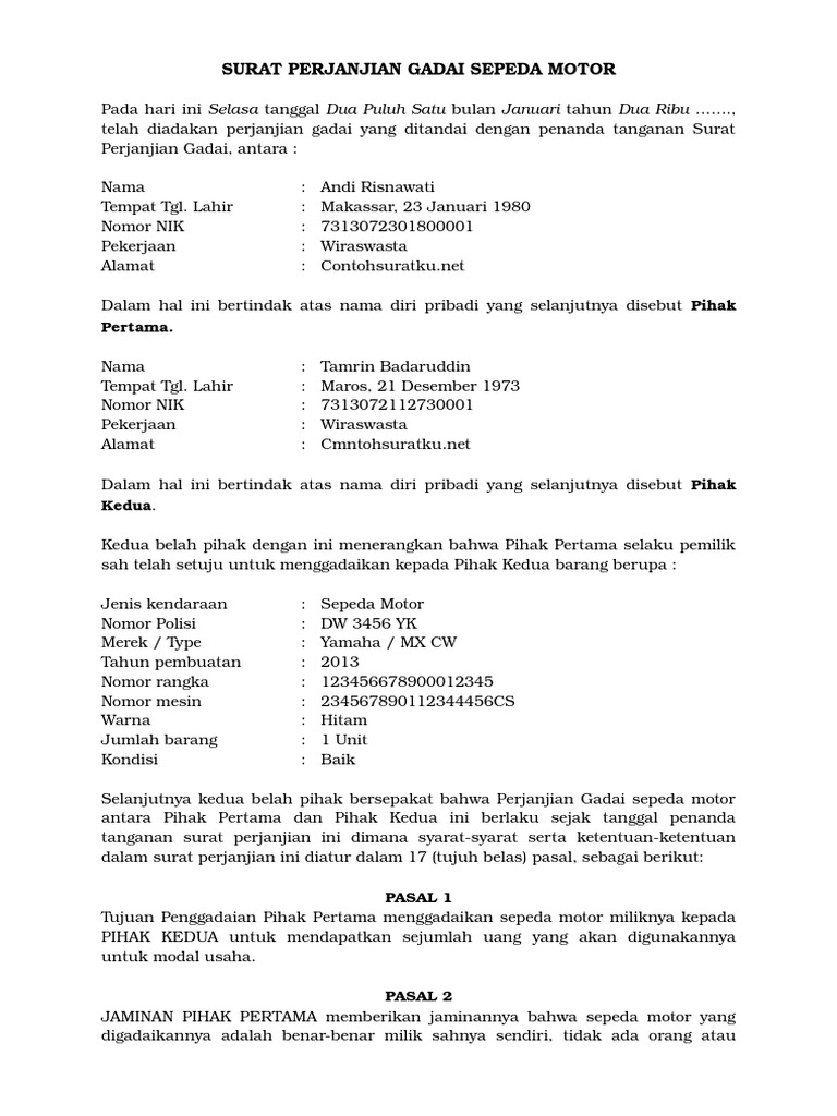 Asli Contoh Surat Perjanjian Gadai Mobil Yang Sering Di Pakai Demikianlah ada 2 buah contoh surat perjanjian gadai mobil yang bisa kami berikan kepada Anda, semoga dalam contoh surat tersebut bermanfaat serta membantu bila ada seseorang yang sedang membutuhkannya, terutama bila orang tersebut belum pernah membuatnya atau belum tahu model... Contoh Surat Perjanjian Gadai Yang Baik Dan Benar | detikLife Contoh Surat Perjanjian gadai - detiklife.com. Apa itu gadai ? gadai adalah hak yang diperoleh pemberi pinjaman atas suatu barang yang bergerak yang diberikan kepadanya oleh peminjam untuk menjamin suatu utang. Misalkan saja jika Anda memiliki suatu barang berharga maka Anda bisa... Contoh Surat Perjanjian Gadai Mobil Masih Kredit yang Sah Kehidupan yang serba praktis menuntut kebutuhan hidup yang kian beragam. Untuk memenuhi kebutuhan hidup yang semakin beragam tersebut tentu saja membutuhkan biaya yang tidak sedikit. Maka dari itu, banyak orang yang bekerja keras untuk mencukupi segala kebutuhannya.