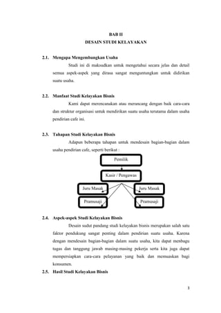 Proposal Studi Kelayakan Bisnis Cafe | PDF Manfaat Studi Kelayakan Bisnis Kami dapat merencanakan atau merancang dengan baik cara-cara dan struktur organisasi untuk mendirikan suatu usaha terutama dalam usaha pendirian cafe ini. 2.3. Tahapan Studi Kelayakan Bisnis Adapun beberapa tahapan untuk mendesain bagian-bagian dalam usaha pendirian cafe, seperti berikut : Pemilik Kasir / Pengawas ... MAKALAH STUDI KELAYAKAN BISNIS.docx - BAB I PENDAHULUAN 1 ... View MAKALAH STUDI KELAYAKAN BISNIS.docx from MAKALAH 1 at Universitas Indonesia. BAB I PENDAHULUAN 1.1 Latar Belakang Di jaman sekarang kebanyakan orang tertarik untuk membuat sesuatu yang unik dan