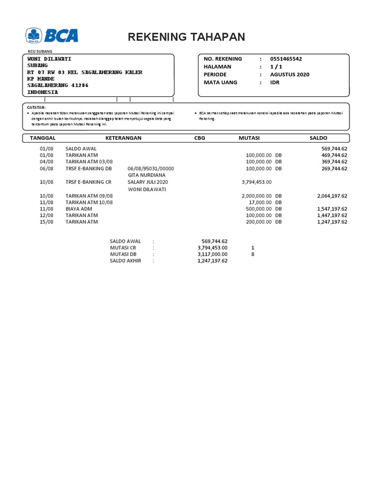 Contoh rekening koran bank bca. Contoh Rekening Koran 3 Bulan Terakhir - DerivBinary.com Nasabah bank BCA memang bisa meminta catatan transaksi dalam bentuk rekening koran salah satu contoh yang paling umum adalah history transaksi 3 bulan terakhir. Jan 05 2020 Fungsi rekening koran pada dasarnya sama dengan buku tabungan yakni menampilkan transaksi yang terjadi selama kurun waktu tertentu umumnya 3 bulan. 41 contoh rekening koran bank bca - Info Investasi Emas 41 contoh rekening koran bank bca. Biaya cetak rekening koran sangat beragam bergantung kebijakan masing-masing bank. Sebagai contohnya : Bank Mandiri = Rp2.500 per/lembar (transaksi 3 bulan terakhir), Rp5.000 per lembar (6 bulan) Bank Permata = Rp10.000 per/lembar Bank BNI = Rp2.500 sampai dengan Rp3.000 per/lembar Bank BRI = Rp25.000 per ... Rekening Koran BCA 3 Bulan Terakhir (Cara Cetak & Biaya) Rekening Koran BCA 3 Bulan Terakhir - Bicara mengenai dunia perbankan mungkin tidak akan pernah ada habisnya. Berbagai macam hal baru akan terus bermunculan seiring dengan perkembangan teknologi yang ada. Sebagai salah satu bank swasta terbesar, BCA juga punya cukup banyak hal menarik yang patut untuk kita bahas. Cetak Rekening Koran BCA Lewat HP dan Laptop Tanpa Ke Bank Cetak rekening koran BCA dari HP maupun laptop bukan perkara sulit yang bisa kita lakukan ketika ingin melihat rincian transaksi BCA tanpa ke bank. Bagi kamu yang ingin melihat detail transaksi atau diminta rekening koran BCA maka tidak perlu bingung lagi.