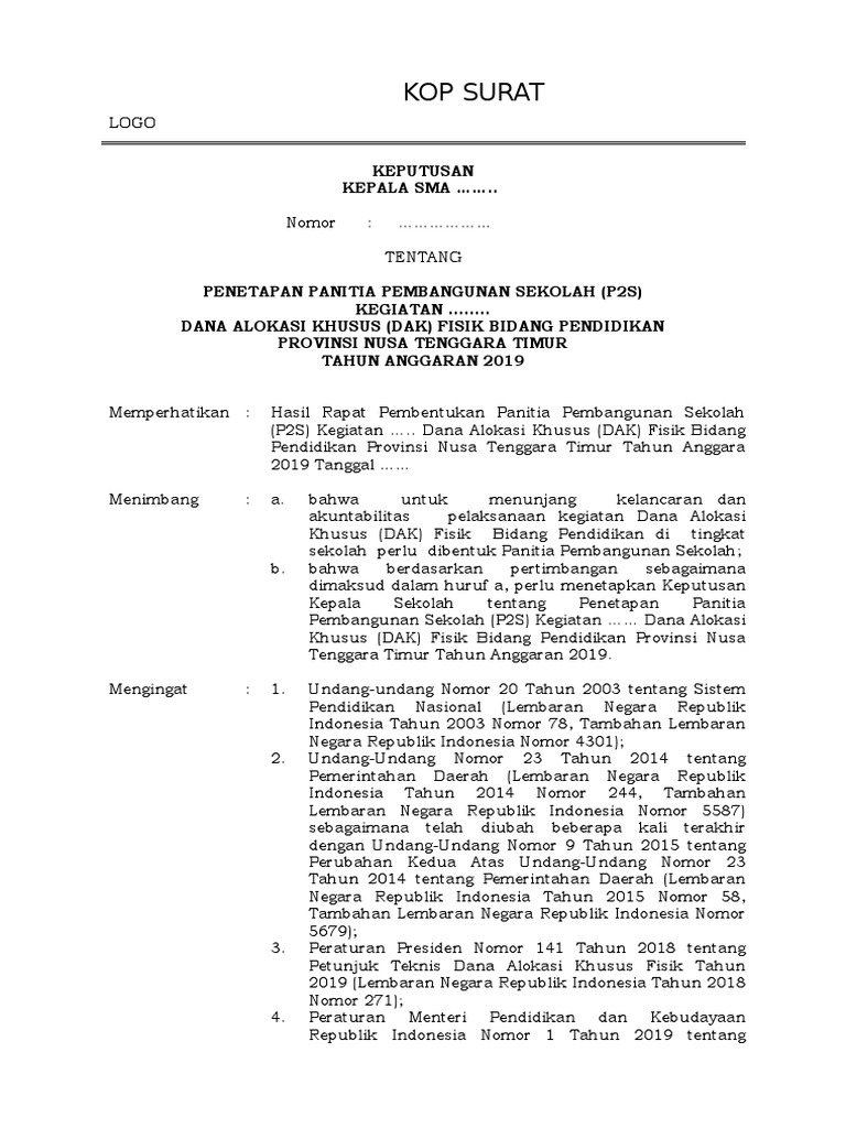 (Doc) Proposal Dana Alokasi Khusus (Dak) Bidang Smp Negeri ... Menimbang : Bahwa dalam rangka melaksanakan kegiatan rehab gedung SMP Negeri 1 Kemusu Tahun 2010 dari Dana Alokasi Khusus (DAK) maka dipandang perlu menetapkan Panitia Pelaksana Rehab Gedung, dan untuk penetapannya diperlukan surat keputusan Kepala Sekolah. Mengingat : 1.