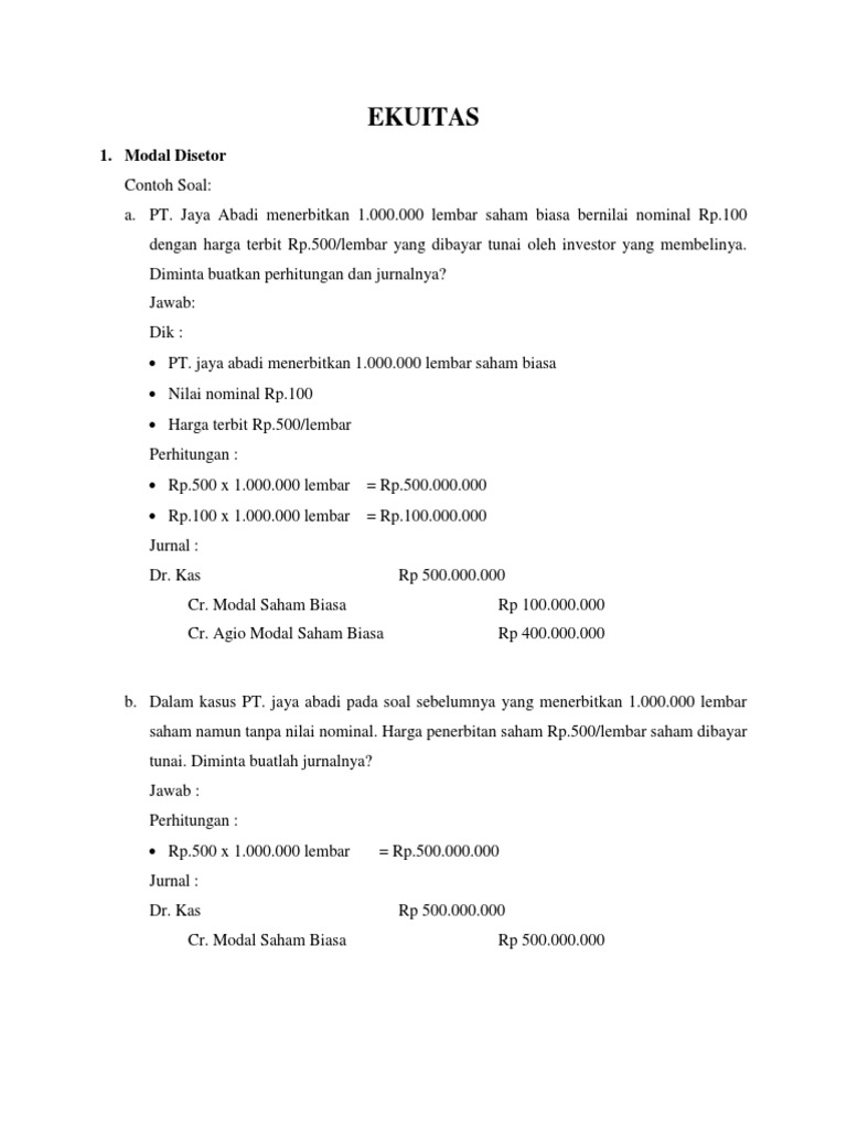 Saham Preferen; Pengertian, Jenis, dan Keunggulan Sebagai contoh, saham preferen abadi dan tidak dapat ditebus (perpetual and nonredeemable preferred shares) diklasifikasikan sebagai ekuitas. Sebaliknya, saham preferen dengan pelunasan wajib pada jumlah yang tetap di masa mendatang diklasifikasikan sebagai liabilitas keuangan. Pengertian / Arti Definisi Saham Biasa Dan Saham Preferen - Ilmu... A. Saham Biasa. Saham Biasa adalah suatu sertifikat atau piagam yang memiliki fungsi sebagai bukti pemilikan suatu perusahaan dengan berbagai aspek-aspek penting bagi perusahaan. Pemilik saham akan mendapatkan hak untuk menerima sebagaian pendapatan tetap / deviden dari perusahaan serta... ZonaAman.Com: contoh saham biasa dan saham preferen gambar galau berat. contoh saham biasa dan saham preferen. LABADITAHAN DAN OPSI SAHAM Seperti telah Anda k... Perseroan: modal disetor. latihan soal ujian (2). lowongan cpns 2017 (2).