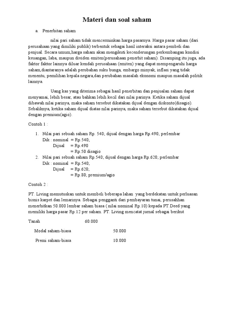 Contoh Soal Dan Jawaban Penilaian Saham Biasa - Contoh Soal... Pengertian dan contoh saham biasa dan saham preferen saham merupakan sebuah modal awal yang diperlukan sebelum memasuki dunia investasi saham. Tks for yr coming 27 maret 2017 1612 surya wardhana mengatakan. Latihan soal dan jawaban investasi saham pada tanggal 2 januari...
