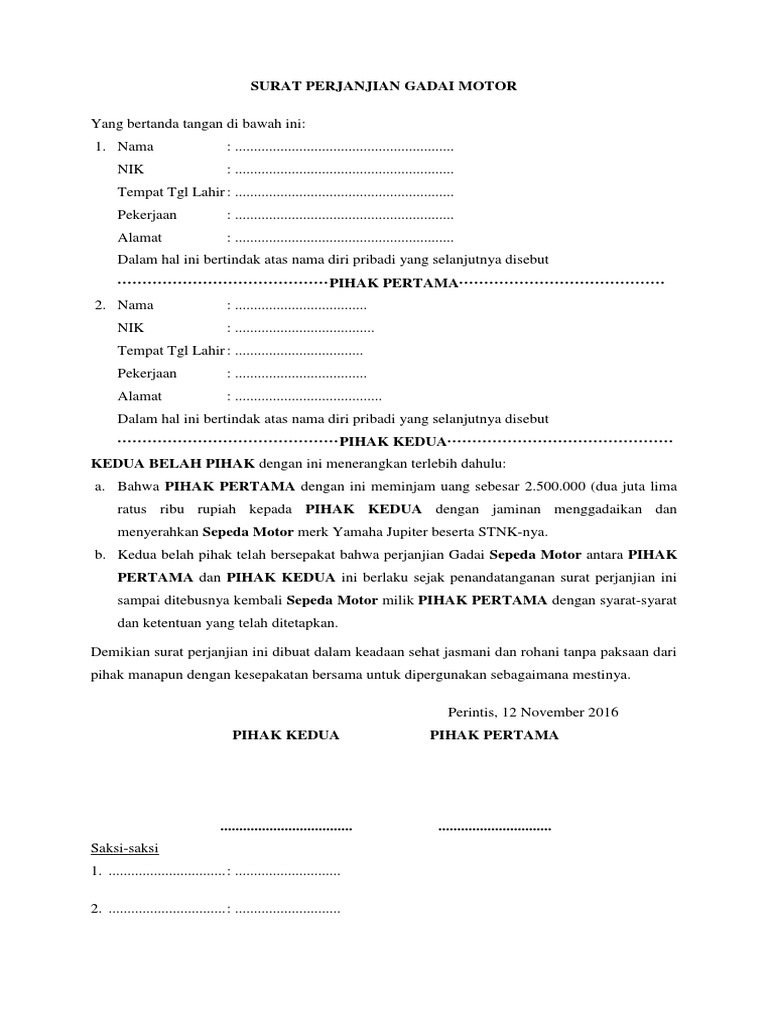 Contoh surat perjanjian gadai motor. Perjanjian Gadai Tanah Lengkap : Contoh Surat Gadai Motor... Contoh surat perjanjian gadai tanah makeup looks ideas trends. ( n a m a ), ( u m u r ), ( pekerjaan ), ( alamat lengkap ), ( nomer ktp / sim ), dalam hal ini bertindak atas. Di dalam surat perjanjian gadai tanah asli telah diposting dengan harapan bahwa kami dapat memberi anda inspirasi untuk membuat... Contoh Surat Perjanjian Gadai Yang Baik Dan Benar | detikLife Contoh Surat Perjanjian gadai - detiklife.com. Apa itu gadai ? gadai adalah hak yang diperoleh pemberi pinjaman atas suatu barang yang bergerak yang diberikan kepadanya oleh peminjam untuk menjamin suatu utang. Misalkan saja jika Anda memiliki suatu barang berharga maka Anda bisa... 10+ Contoh Surat Perjanjian Gadai Mobil, Sawah, Motor, Rumah... Contoh Surat Perjanjian Gadai - Gadai adalah cara yang biasa dilakukan seseorang untuk mendapatkan pencairan dana secara instan dengan menawarkan asset-asset yang dimilikinya sebagai jaminan. Besarnya nilai dana yang bisa dicairkan sangat bergantung dengan nilai asset yang... Contoh Surat Perjanjian Gadai Sepeda Motor Lengkap 2019 Mar 27 - Berikut ini Contoh Surat Perjanjian Gadai Sepeda Motor Lengkap dengan pasal-pasal yang berisi seluruh ketentuan gadai dan mengikat pihak terkait.