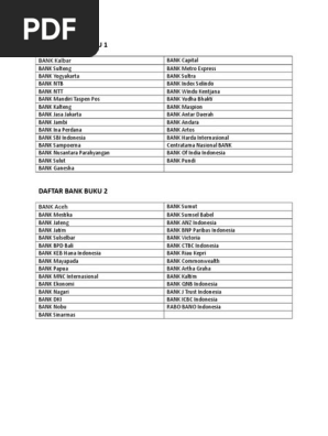 Daftar Bank Buku 1,2,3,4 | PDF - Scribd DAFTAR BANK BUKU 1. BANK Kalbar BANK Capital BANK Sulteng BANK Metro Express BANK Yogyakarta BANK Sultra BANK NTB BANK Index Selindo BANK NTT BANK Windu Kentjana BANK Mandiri Taspen Pos BANK Yudha Bhakt BANK Kalteng BANK Maspion BANK Jasa Jakarta BANK Antar Daerah BANK Jambi BANK Andara BANK Ina Perdana BANK Artos BANK SBI Indonesia BANK Harda Internasional BANK Sampoerna Centratama Nasional ...