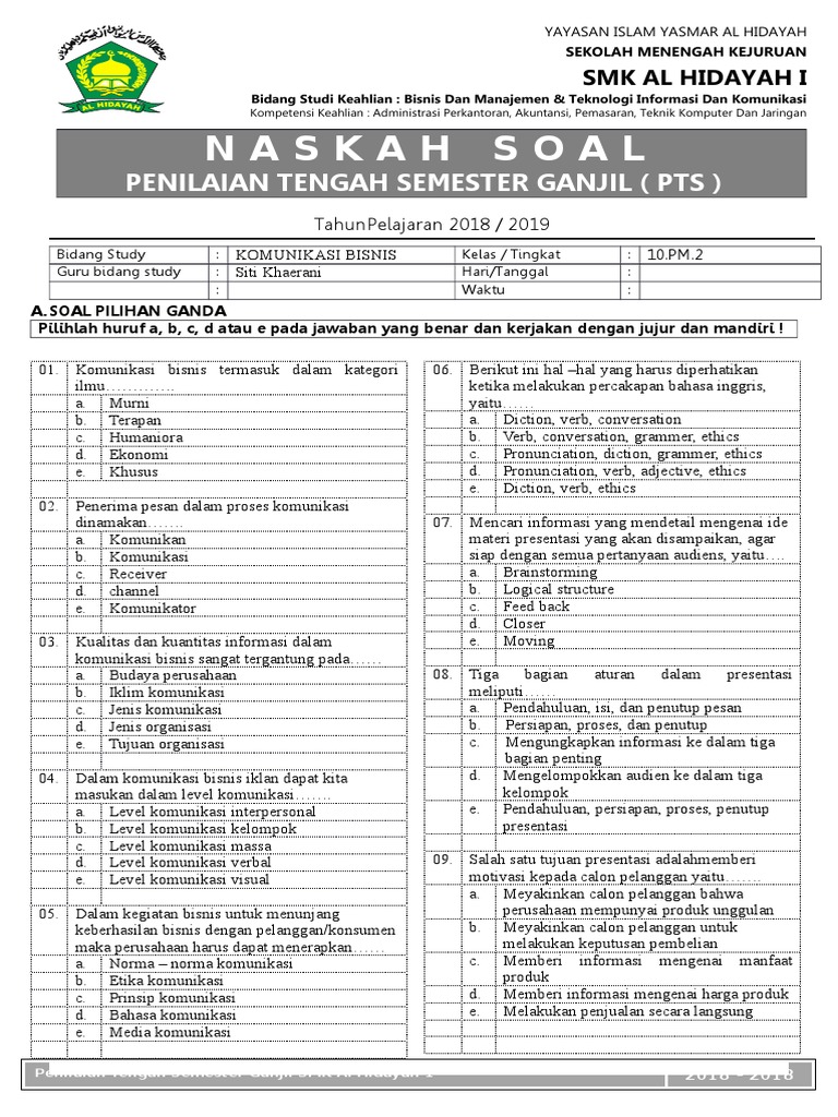 KOMUNIKASI BISNIS - pratama362 TUGAS 1 KELOMPOK 6 MATERI 1-5. BAB I. DASAR KOMUNIKASI DAN KOMUNIKASI BISNIS. 1.1 Pengertian dan Cakupan Komunikasi Bisnis. Pengertian : Komunikasi adalah suatu proses penyampaian dan penerimaan pesan atau informasi diantara dua orang atau lebih dengan harapan terjadinya pengaruh yang positif atau menimbulkan efek tertentu yang diharapkan. Dalam ilmu ekonomi, bisnis adalah suatu organisasi ... Komunikasi Bisnis termasuk ke dalam kategori ilmu.docx - 1 ... 1. Komunikasi Bisnis termasuk ke dalam kategori ilmu ..... a. Murni c. Humaniora b. Terapan d. Ekonomi e. Komunikasi 2. Pesan komunikasi bisnis yang disajikan secara personal adalah pesan yang ditujukan kepada … a. kelompok b. perorangan c. khalayak besar d. kelompok kecil e. Kelompok besar 3. Variabel-variabel komunikasi secara klasik dirumuskan dalam formula, who, says what, to whom ... LAT UTS KOMUNIKASI BISNIS Quiz - Quizizz Q. Komunikasi bisnis adalah pertukaran gagasan, pendapat, informasi, instruksi, Dan sebagainya yang memiliki tujuan tertentu yang disajikan secara personal dan impersonal melalui simbol-simbol atau sinyal-sinyal untuk mencapai tujuan organisasi. Komunikasi Bisnis x pm.doc - SOAL_MNG_KJD_XPD MULTIPLE ... Komunikasi bisnis termasuk dalam kategori ilmu … A. Murni B. Terapan C. Humaniora D. Campuran E. Ekonomi ANS : B 5. Komunikasi bisnis adalah pertukaran gagasan, pendapat, informasi, instruksi, dan sebagainya yang memiliki tujuantertentu yang disajikan secara personal dan impersonal melalui simbol-simbol atau sinyal-sinyal untuk mencapai ...