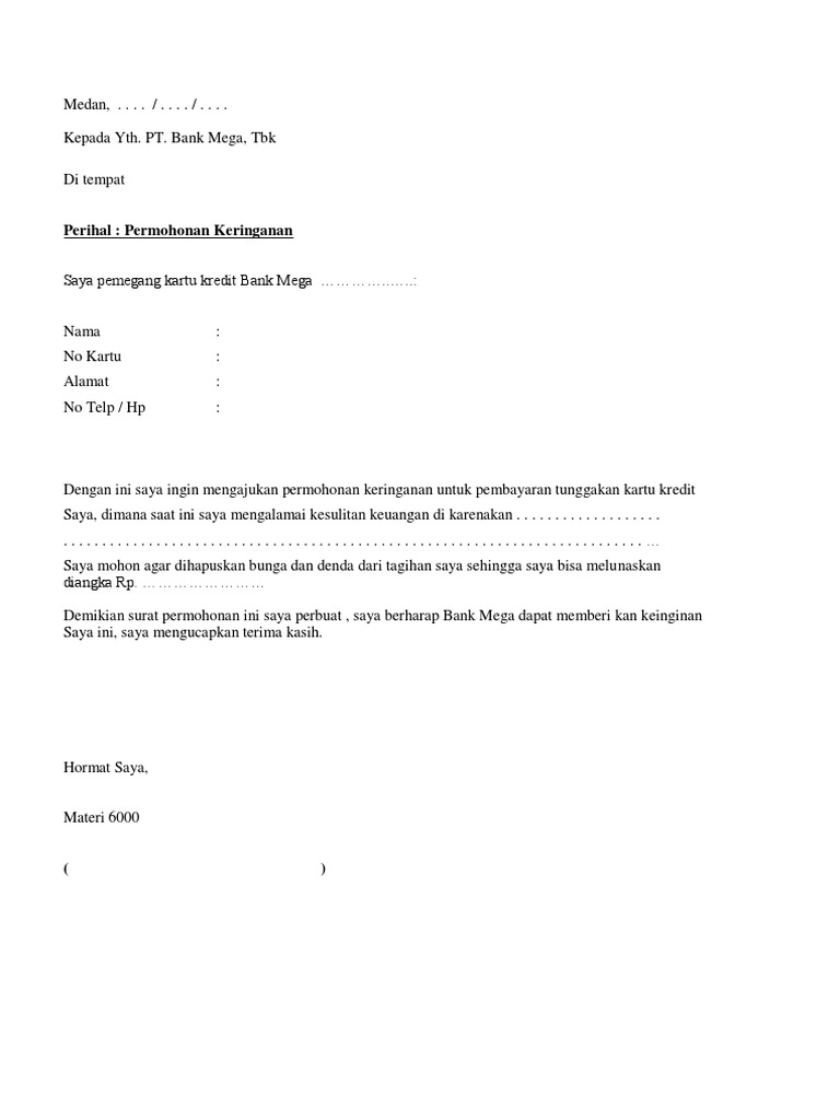 Contoh Surat Permohonan Kredit - Content Misalnya seperti surat permohonan bayar spp, tunggakan cicilan kredit, keterlambatan pembayaran proyek, dan sebagainya. Contoh surat permohonan keringanan pembayaran kartu kredit mandiri. Dnegan ini mengajukan permohonan kredit untuk tujuan perluasan usaha sebesar rp 800.000.000 (delapan ratus juta rupiah) dnegan jangka waktu 8 (delapan) tahun. Surat Permohonan Keringanan Pembayaran / Surat penurunan ... Artikel kali ini akan menyajikan contoh surat permohonan keringanan pembayaran kartu kredit mandiri. Contoh surat permohonan keringanan ukt. Text of surat permohonan keringanan denda. 4988 5381 6013 9728 4988 5350 0020 6402 5408 8940 0004 7780 dengan ini mengajukan permohonan keringanan pembayaran dan permohonan untuk dijadikan . PDF Formulir Permohonan Keringanan Tagihan Kartu Kredit Akibat ... formulir permohonan keringanan tagihan kartu kredit akibat Covid-19 ~ ^Formulir Perlakuan Khusus _ yang juga berlaku sebagai addendum atas Perjanjian Kredit. 4. Bahwa sehubungan dengan permohonan perlakuan khusus atas fasilitas kredit sebagaimana butir 2 diatas, maka