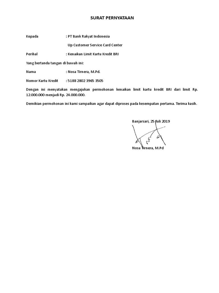 Great Contoh Surat Pernyataan Naik Limit Kartu Kredit 24 ... Great Contoh Surat Pernyataan Naik Limit Kartu Kredit 24 Di Inspirasi Menulis Surat Pernyataan pada post Contoh Surat Pernyataan Naik Limit Kartu Kredit - Semoga dengan Gawe CV post beberapa contoh , dapat menjadikan anda lebih baik lagi dalam berkreasi serta menulis surat yang baik dan menarik.