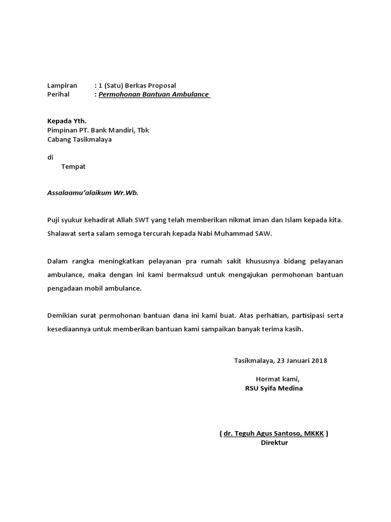Contoh Surat Pengantar Proposal Sumbangan Dana Kepada Yth, Bapak H. Usma Ali. Di-Tempat. Hal : Permohonan Bantuan Dana. Lamp. : 1 (satu) bandel proposal. Assalamu'alaikum Wr. Wb. Salam sejahetera kami haturkan, semoga kita senantiasa dalam lindungan Allah SWT. serta dimurahkan rizki, amin.