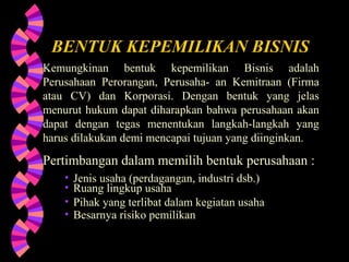 Bentuk - Bentuk Kepemilikan Bisnis | PDF - Scribd Adapun berbagai aspek yang perlu dipertimbangkan dalam menentukan bentuk kepemilikan bisnis antara lain mencakup : 1. Sejauh mana pertanggung jawaban pemilik terhadap perusahaan. 2. Sejauh mana kemudahan2 yang diinginkan untuk memulai usaha bisnis. 3. Sejauh mana ketersediaan permodalan/sumber keuangan yang dimiliki pemilik 4.