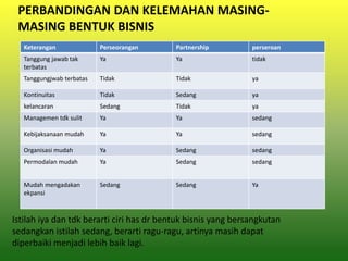 linda umar blog: Makalah Bentuk-bentuk Kepemilikan bisnis Dan tak dapat kita hindari, semua bentuk kepemilikan bisnis memiliki keunggulan dan kelemahannya masing masing, yakni ; 1. Perusahaan Perseorangan. Keunggulannya yaitu mudah dibentuk, bentuk kepemilikan paling murah untuk dimulai, Insentif laba, kewenagan penuh untuk mengambil keputusan, tidak ada pembatasan hukum khusus, dan mudah dihentikan.