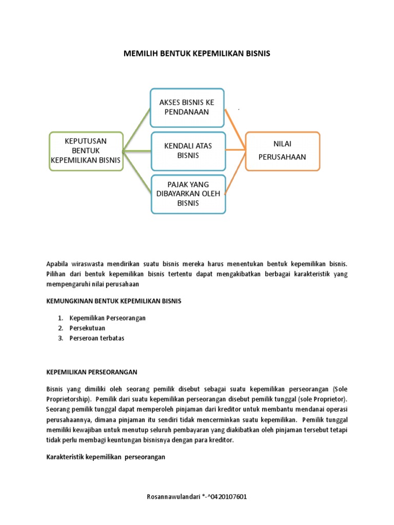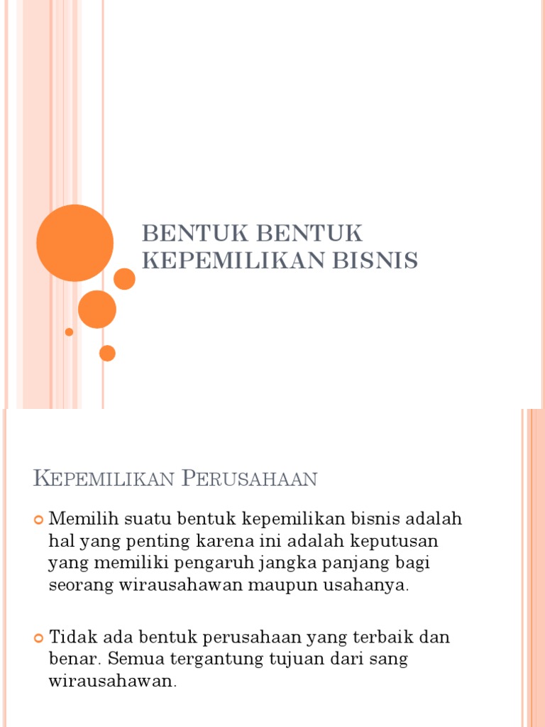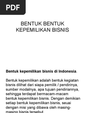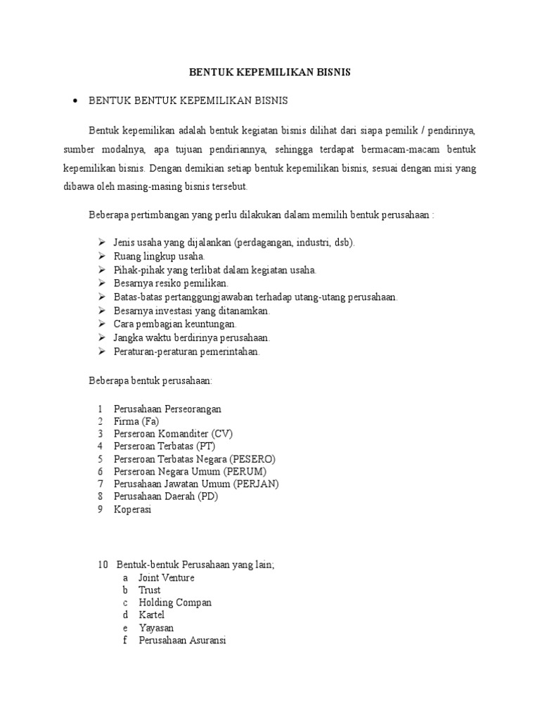 BENTUK KEPEMILIKAN BISNIS - PDF Free Download bentuk kepemilikan bisnis Kemungkinan bentuk kepemilikan Bisnis adalah Perusahaan Perorangan, Perusaha- an Kemitraan (Firma atau CV) dan Korporasi. Dengan bentuk yang jelas menurut hukum dapat diharapkan bahwa perusahaan akan dapat dengan tegas menentukan langkah-langkah yang harus dilakukan demi mencapai tujuan yang diinginkan.