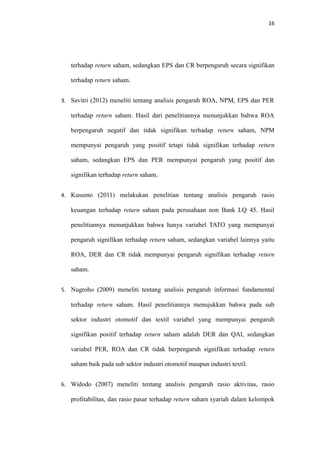 Pengaruh Kinerja Keuangan Perusahaan terhadap Return Saham ... Pengaruh Kinerja Keuangan Perusahaan terhadap Return Saham untuk mengkaji hubungan kinerja keuangan perusahaan dengan return saham. Tinjauan Pustaka dan Hipotesis Berikut adalah hasil penelitian yang berkaitan dengan kinerja keuangan dan return saham, yaitu sebagai berikut: hasil penelitian Ganto, et al. (2008)