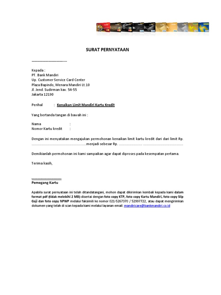 SURAT PERNYATAAN - Mandiri Kartu Kredit PT. Bank Mandiri Up. Customer Service Card Center Plaza Bapindo, Menara Mandiri Lt.10 Jl. Jend. Sudirman kav. 54-55 Jakarta 12190 Perihal : Kenaikan Limit Mandiri Kartu Kredit Yang bertanda tangan di bawah ini : Nama : Nomor Kartu kredit : Dengan ini menyatakan mengajukan permohonan kenaikan limit kartu kredit dari dari limit Rp.