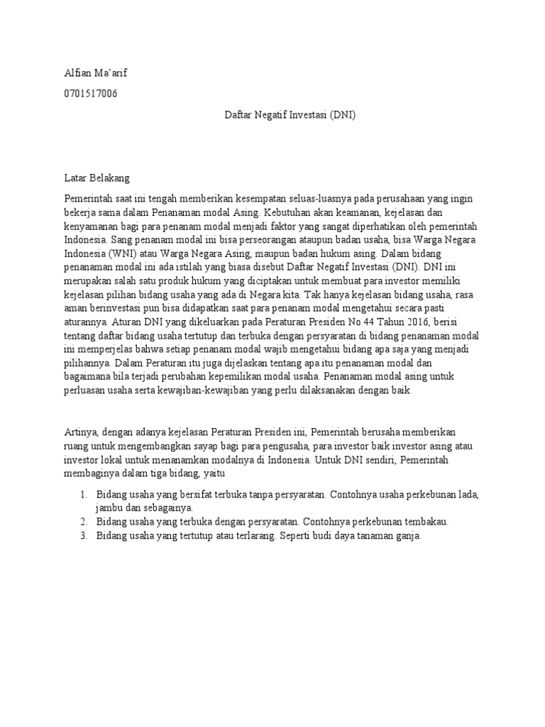 (Pdf) Dampak Perubahan Daftar Negatif Investasi Sektor ... Daftar Negatif Investasi (DNI) adalah pengaturan daftar bidang-bidang usaha yang tertutup dan bidang-bidang usaha yang terbuka dengan persyaratan di bidang penanaman modal. 6
