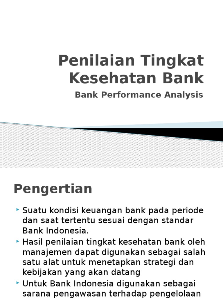 ANALISIS TINGKAT KESEHATAN BANK DENGAN PENDEKATAN ... Dalam penelitian ini dilakukan penilaian terhadap 4 aspek yaitu aspek risk profile melalui rasio NPL, IRR dan LDR, aspek Good Corporate Governance, aspek ... PERATURAN BANK INDONESIA - OJK Jan 27, 2016 ... MEMUTUSKAN: Menetapkan : PERATURAN OTORITAS JASA KEUANGAN TENTANG. PENILAIAN TINGKAT KESEHATAN BANK UMUM. BAB I. KETENTUAN UMUM. Pasal 1. Dalam ...
