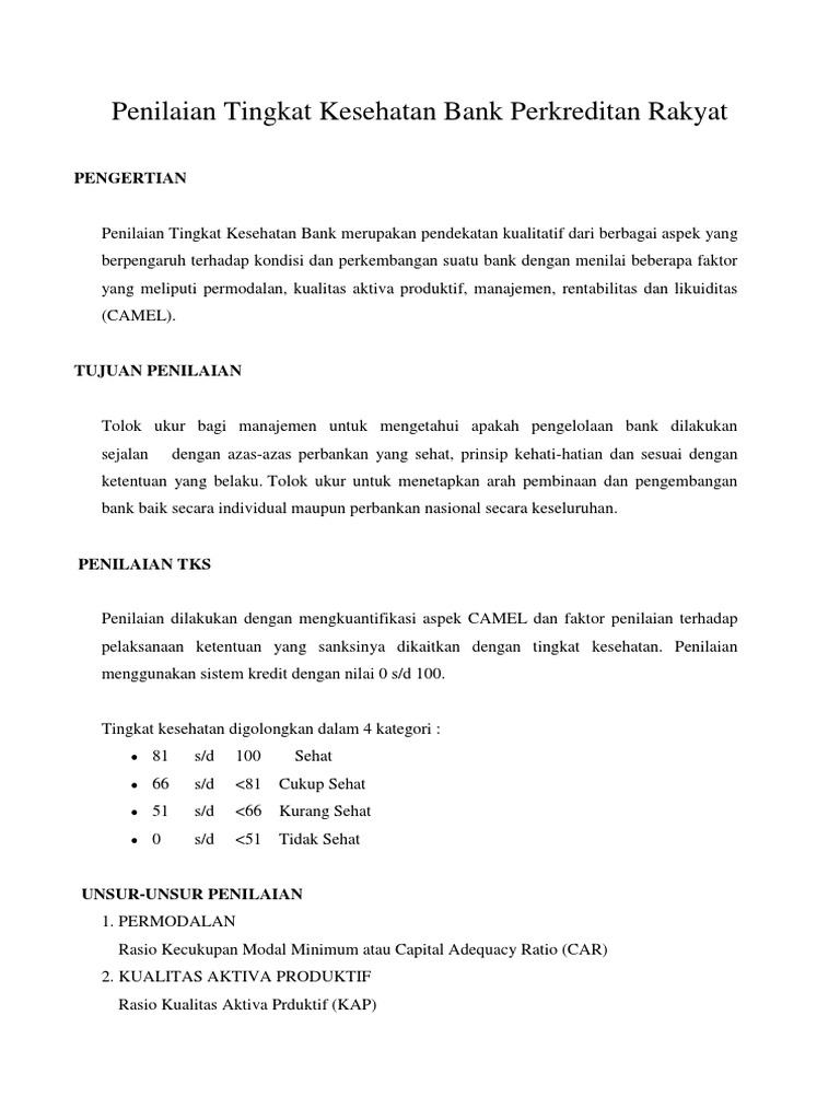 PENILAIAN KESEHATAN PERBANKAN May 19, 2015 ... 2. Tingkat Kesehatan Bank merupakan hasil penilaian kualitatif atas berbagai aspek yang berpengaruh terhadap kondisi atau kinerja suatu Bank ... Sistem Penilaian Tingkat Kesehatan Bank Pembiayaan Rakyat ... Dec 16, 2019 ... Sistem Penilaian Tingkat Kesehatan Bank Pembiayaan Rakyat Syariah. Sektor : Perbankan. SubSektor : Bank Umum. Jenis Regulasi : Surat Edaran OJK. metode rgec : penilaian tingkat kesehatan bank pada perusahaan ... Berdasarkan PBI No.13/1/PBI/2011 Tentang Penilaian Tingkat kesehatan Bank secara individual dengan menggunakan pendekatan risiko (Risk-Based Bank Rating).