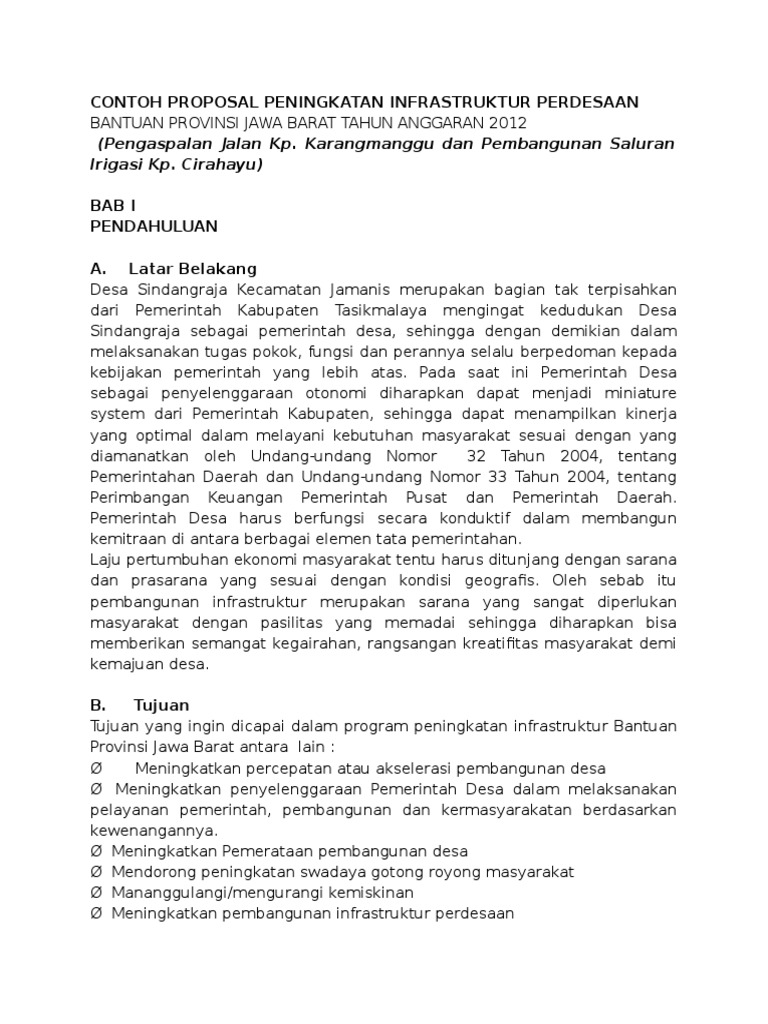 Proposal Bantuan Dana Infrastruktur | PDF - Scribd proposal. permohonan bantuan dana pembangunan sektor infrastruktur untuk pengaspalan jalan desa, jalan lingkungan desa, tembok penahan tanah, tembok saluran air pertanian, jembatan dan gorong-gorong. lokasi kegiatan; desa kecamatan kabupaten propinsi : tunggilis : kalipucang : ciamis : jawa barat. diusulkan oleh :