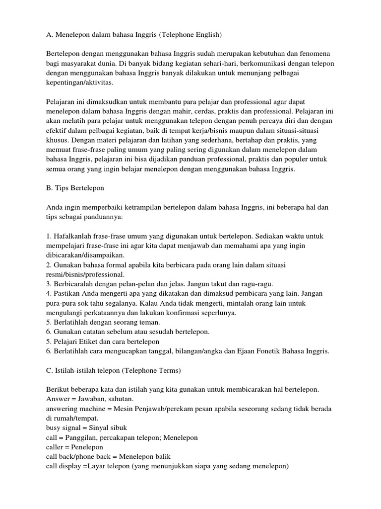 Berbicara Melalui Telepon dalam Bahasa Inggris | EF Blog Berbicara Melalui Telepon dalam Bahasa Inggris. speaking tips dialog kalimat sehari-hari. 2020.04.23. Ketika kita berbicara lewat telepon, seringkali bingung cara memulai percakapan dalam bahasa Inggris. Sebenarnya banyak percakapan yang dapat dilakukan dalam telepon dengan menggunakan bahasa Inggris. Percakapan Telepon Singkat: Meninggalkan Pesan - Sederet.com Ada pembelajaran tersendiri untuk mempelajari bahasa Inggris menggunakan Telephone. Bagaimana cara menelpon, berbicara ditelpon sampai meninggalkan pesan. Telephone English memiliki ekspresi sendiri yang berbeda dengan percakapan tatap muka. Tahapan Meninggalkan Pesan Bahasa Inggris Berikut akan dibahas bagaimana meninggalkan pesan melalui telephone dalam Bahasa Inggris. Contoh Percakapan Bahasa Inggris Melalui Telepon tentang ... Pada kesempatan kali ini, saya ingin memberikan contoh percakapan Bahasa Inggris melalui telepon tentang bisnis. Ketika melakukan percakapan, ada 2 hal yang tidak dapat dipisahkan, yakni grammar dan tenses.Kedua hal tersebut dilperlukan dalam bisnis supaya lawan bicara mengerti maksud dari tujuan kita ketika melakukan percakapan, dan agar tidak terjadi kesalahpahaman.