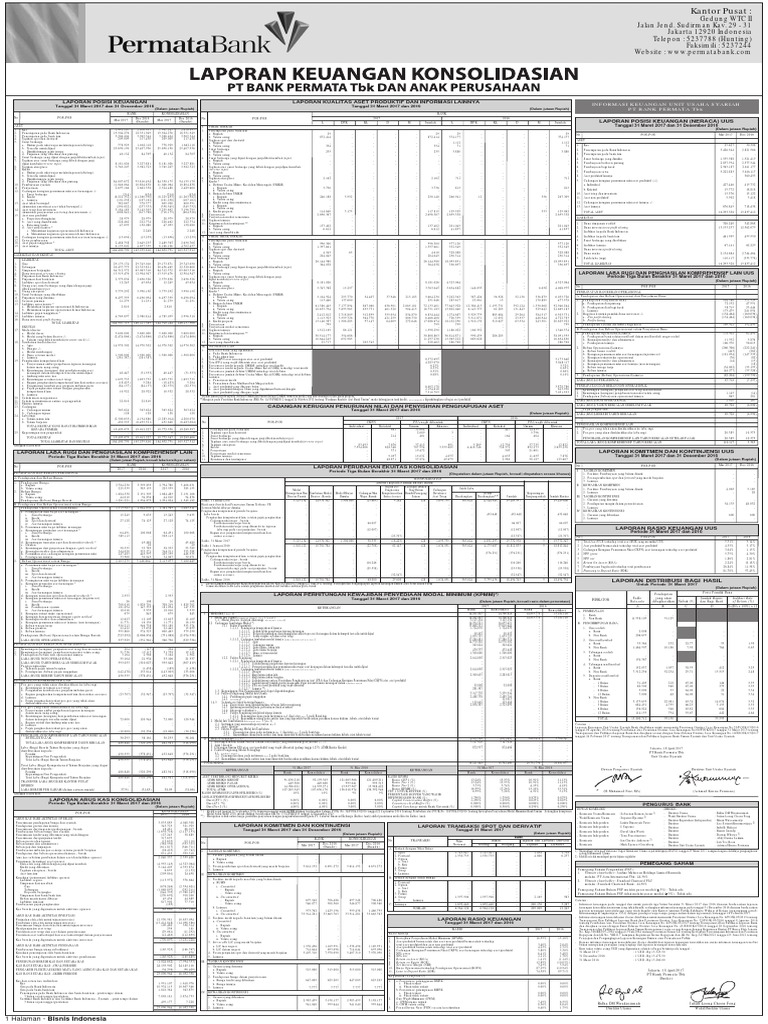 Laporan Keuangan - PT. Bank Permata Tbk (BNLI) | IDNFinancials sebagaimana tercantum dalam laporannya tanggal 14 Agustus 2020 yang tidak tercantum dalam publikasi ini. Informasi keuangan. 231. Penerimaan pendapatan provisi dan komisi. 577.229. 622.509. Keterangan : pada tanggal 31 Desember 2019 disusun berdasarkan laporan keuangan konsolidasian Bank dan entitas anak, yang disusun oleh. PDF PermataBank AR 2017 (29-03-2018) LR - Indonesia Stock Exchange Laporan Tahunan 2017 Annual Report Strengthening Fundamentals for Sustainable Growth. 2017 was a year of consolidation for ... Jawab atas Laporan Tahunan PT Bank Permata Tbk Tahun 2017 Member of the Board of Commissioners and the Board of Directors Statement of Accountability of Annual Report 2017 PT Bank Permata Tbk 1 2 PDF A Commitment for All - Permata Bank 12 PermataBank * Laporan Tahunan 2012 PT Bank Permata Tbk ("PermataBank") adalah bank yang memiliki layanan lengkap di Indonesia, dengan fokus pada nasabah retail, middle market, SME, segmen local corporate dan value chain. Terdaftar di Bursa Efek Indonesia (BEI) dengan kode BNLI, PermataBank memiliki dua pemegang