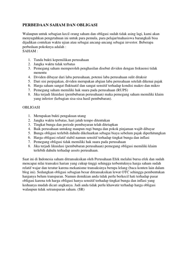 Persamaan Saham dan Obligasi Dalam Dunia Bisnis - Bussines ... Beberapa Persamaan Saham dan Obligasi. Dari sekilas definisi yang sudah disebutkan di atas, saham dan obligasi memang berbeda. Namun dalam beberapa hal, ada beberapa persamaan saham dan obligasi dalam dunia bisnis. Dengan memahami persamaan keduanya, Anda nantinya jadi bisa lebih bijak untuk menggunakan layanan diantara kedua hal berharga tersebut. Apa Perbedaan Saham dan Obligasi? Wajib Dibaca! - Easylabur Perbedaan saham dan obligasi serta persamaan antara keduanya perlu diketahui oleh para calon investor yang ingin menanamkan modalnya dengan membeli sejumlah surat berharga yang menguntungkan. Dengan mengetahui perbedaan saham dan obligasi ini, diharapkan Anda tidak salah memilih sebuah instrumen yang tepat untuk berinvestasi.