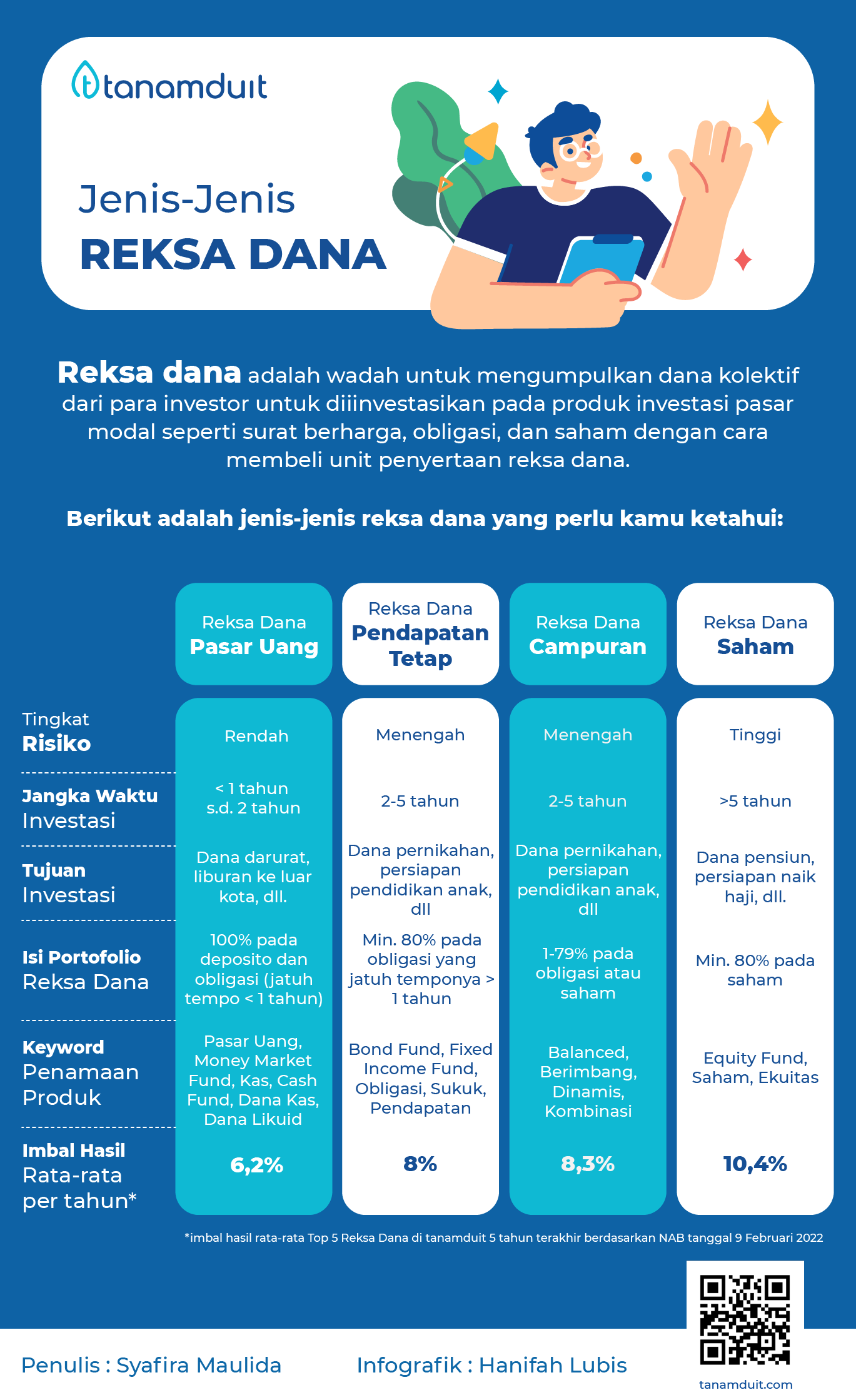 4 Jenis Reksadana Serta Cara Kerjanya! - Pintek 4 Jenis reksadana. Lalu, apa saja jenis investasi reksadana yang bisa membuat rekening kamu menggendut? Berikut empat di antaranya: 1. Reksadana pasar uang. Reksadana pasar uang dialokasikan ke deposito dan surat berharga dengan jatuh tempo di bawah satu tahun. Jadi, gak heran kalau instrumen yang satu ini risikonya lebih kecil dibanding yang lain. Yuk Kenali Jenis Dan Perbedaan Investasi Reksa Dana - Yuk ... Ditambah lagi, reksa dana adalah salah satu jenis investasi dengan modal Perbedaan Reksa dana Saham, Pendapatan Tetap, dan Campuran. Yuk, Kenali Asuransi Kesehatan Syariah Lebih Dalam! Hal ini dilakukan melalui investasi dalam bentuk aset dengan pola pengembalian sesuai dengan syariah yaitu dengan menghadapi risiko tertentu Kenali Jenis Transaksi Reksadana Pada dasarnya terdapat 3 jenis transaksi reksa dana: Subscription atau transaksi pembelian. Saat kamu mengalokasikan sejumlah dana untuk membeli reksa dana tertentu, maka kamu akan memperoleh kepemilikan reksa dana dalam bentuk unit reksa dana, pada NAB atau Nilai Aktiva Bersih di hari tersebut. Mengenal Investasi Reksa Dana: Jenis, Kelebihan, dan ... 2. Reksa Dana Pendapatan Tetap. Reksa dana jenis ini mayoritas uang dialokasikan ke obligasi atau surat hutang. Kedua jenis reksa dana ini sangat cocok untuk investor yang ingin bermain aman karena risikonya terbilang kecil, bukan tanpa risiko. Pasalnya, setiap investasi pasti mempunyai risikonya masing-masing. 3.