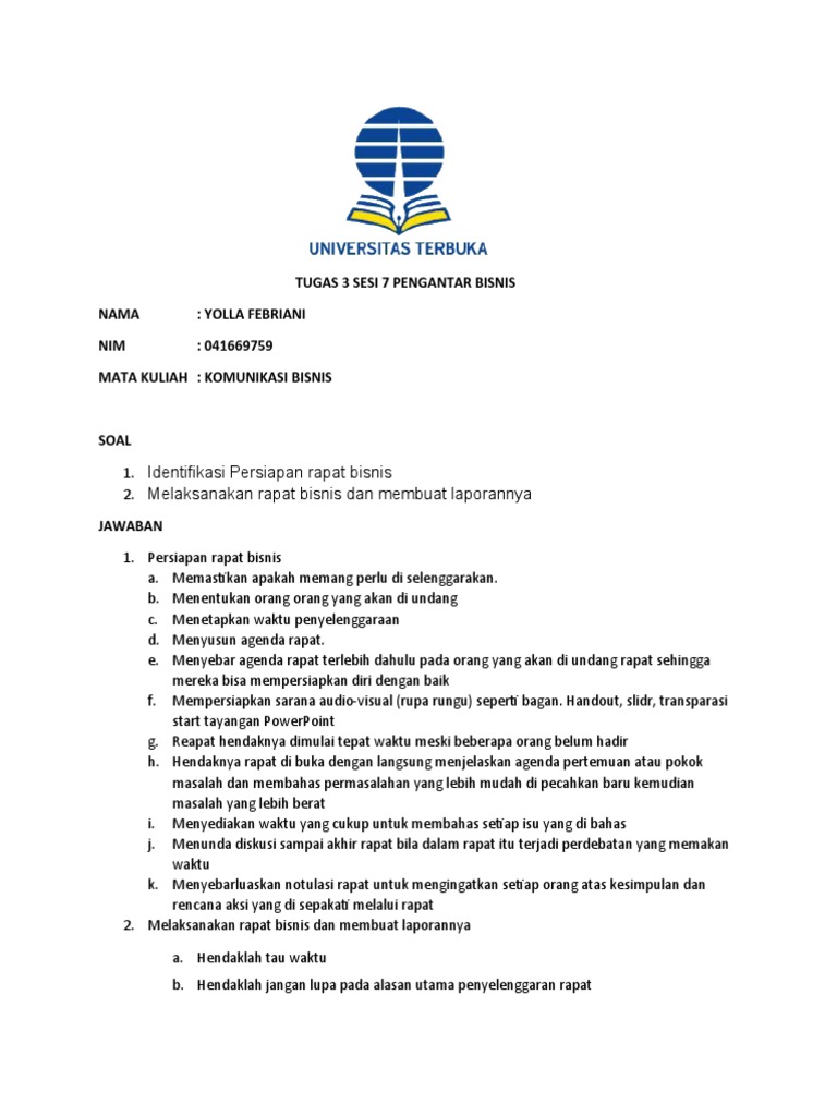 Identifikasi persiapan rapat bisnis. Tugas 3 Komunikasi Bisnis | PDF Nama : Williamson. Nim : 041246846. Komunikasi Bisnis. Tugas 3. 1. Berikut adalah identifikasi persiapan rapat bisnis dari langkah penyelenggaraan,langkah praktis penyelenggaraan dan beberapa hal yang harus di perhatikan dalam penyelenggaraan rapat.. Langkah-langkah penyelenggaraan rapat adalah : Tips Menjalankan Rapat Bisnis yang Efektif - Maxmanroe.com Oleh karena itu persiapan dan keyakinan menjadi kunci pokok bagaimana mampu menjalankan sebuah rapat bisnis dengan baik. Lebih lengkap lagi berikut ini beberapa tips dalam tahapan menjalankan rapat bisnis yang efektif dan efisien. Artikel lain: 7 Tips Agar Mendapatkan Kepercayaan Dari Tim Bisnis Anda. Tahap Persiapan (DOC) KOMUNIKASI BISNIS RAPAT BISNIS - Academia.edu KOMUNIKASI BISNIS RAPAT BISNIS KELOMPOK 6 ARIEF DARMAWAN F3316006 (02) MUNA MUTHMAINAH F3316046 (18) NADYA NOOR ROCHMAH BETY F3316047 (19 Alamat Jalan Ir Sutami No 36-A Kentingan Surakarta. 5 Hal yang Harus Dipersiapkan Sebelum Memulai Rapat 3. Jadilah Menonjol Jangan ragu untuk berpartisipasi atau mengajukan pertanyaan ketika rapat berlangsung. Mintalah pembicara untuk memperjelas atau menguraikan poin-poin yang kurang Anda pahami. Dengan begitu, rekan-rekan kerja Anda akan menyadari bahwa Anda memperhatikan dan berpikir kritis tentang topik yang dibahas. 4.