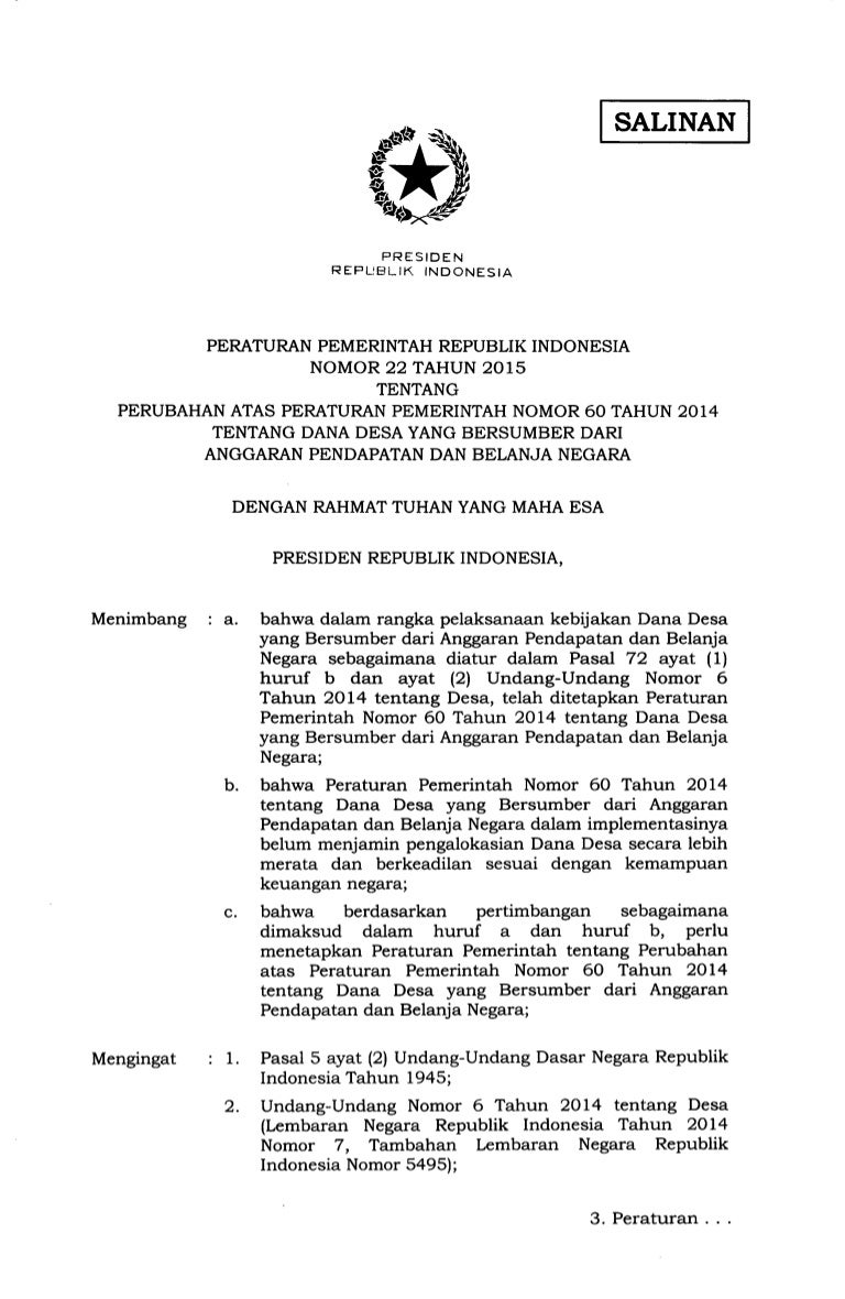 PDF Pengelolaan Dana Desa Setelah Ditetapkan Undang-undang ... Pelaksanaan Undang-Undang Nomor 6 Tahun 2014 tentang Desa, PP Nomor 60 Tahun 2014 tentang Dana Desa yang Bersumber dari Anggaran Pendapatan dan Belanja Negara sebagaimana telah diubah dengan PP Nomor 22 Tahun 2015 tentang Perubahan atas Peraturan Pemerintah Nomor 60 Tahun 2014 tentang Dana PRIORITAS PENGGUNAAN DANA DESA TAHUN 2021 - Website Desa ... Dana Desa adalah amanah dari undang-undang sebagaimana diatur dalam Pasal 72 Ayat 2 UU Nomor 6 Tahun 2014. Sebagai salah satu dari pendapatan desa, maka pemerintah pusat berkewajiban mengalokasi Dana Desa dalam Anggaran Pendapatan Belanja Negara (APBN). Inilah Undang-Undang Desa Nomor 6 Tahun 2014 - Ensiklo.Com Undang-Undang Republik Indonesia Nomor 6 Tahun 2014 Tentang Desa ini justru ada di bawah Kementrian Dalam Negeri. Sehubungan dengan keberadaan UU Desa di bawah Kemendagri tersebut, maka kita pun diarahkan bisa memahami peraturan yang dikeluarkannya. Ada 4 nomor yang bisa kita simak dalam memahami kelanjutan pengaturan perdesaan di Indonesia ini. Undang-Undang tentang Badan Permusyawaratan Desa, Penting! Apa Saja Undang-Undang tentang Badan Permusyawaratan Desa? Sebagaimana Anda ketahui, BPD merupakan lembaga resmi yang dibentuk sesuai dengan aturan yang tertuang dalam Undang-undang tentang Badan Permusyawaratan Desa.Badan Permusyawaratan Desa dipilih dan dilantik secara resmi untuk membantu, mendampingi, dan mengawasi jalannya pemerintahan desa di bawah pimpinan Kepala Desa.