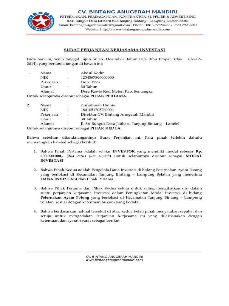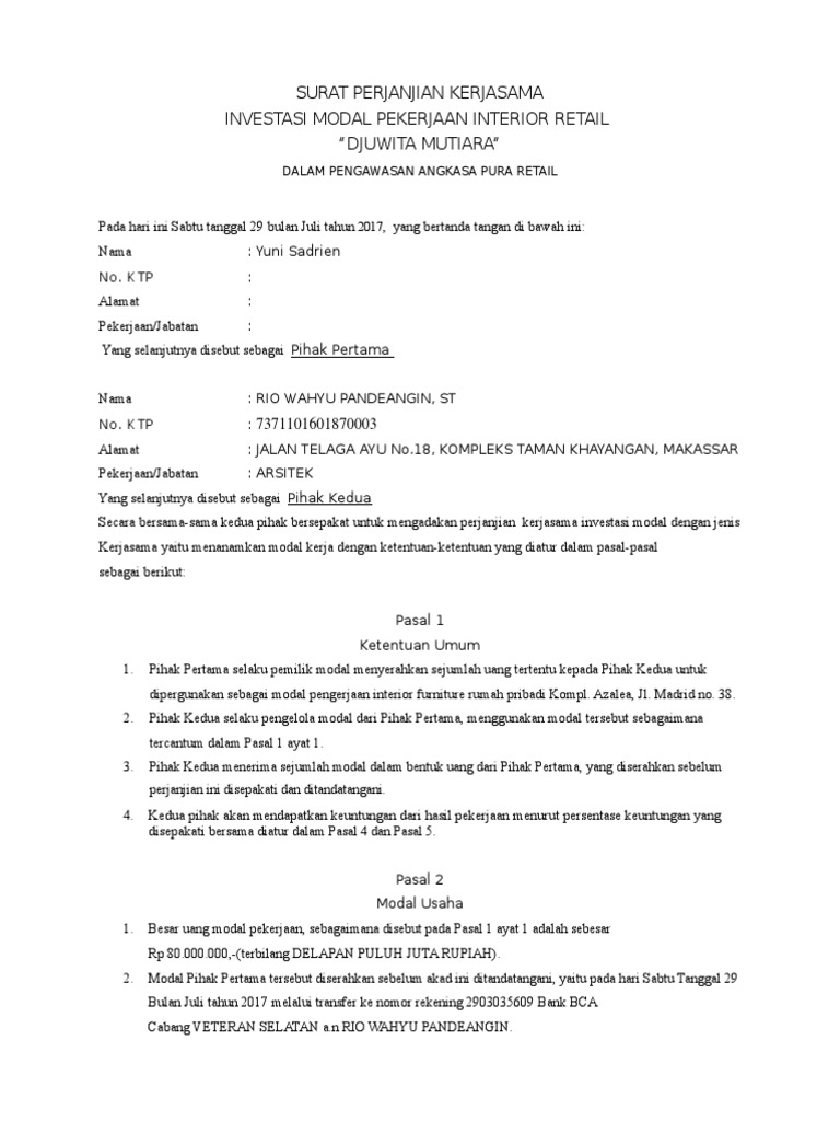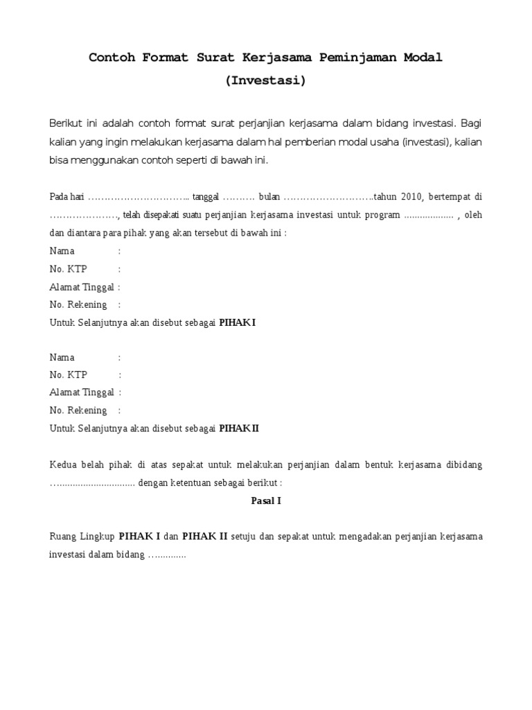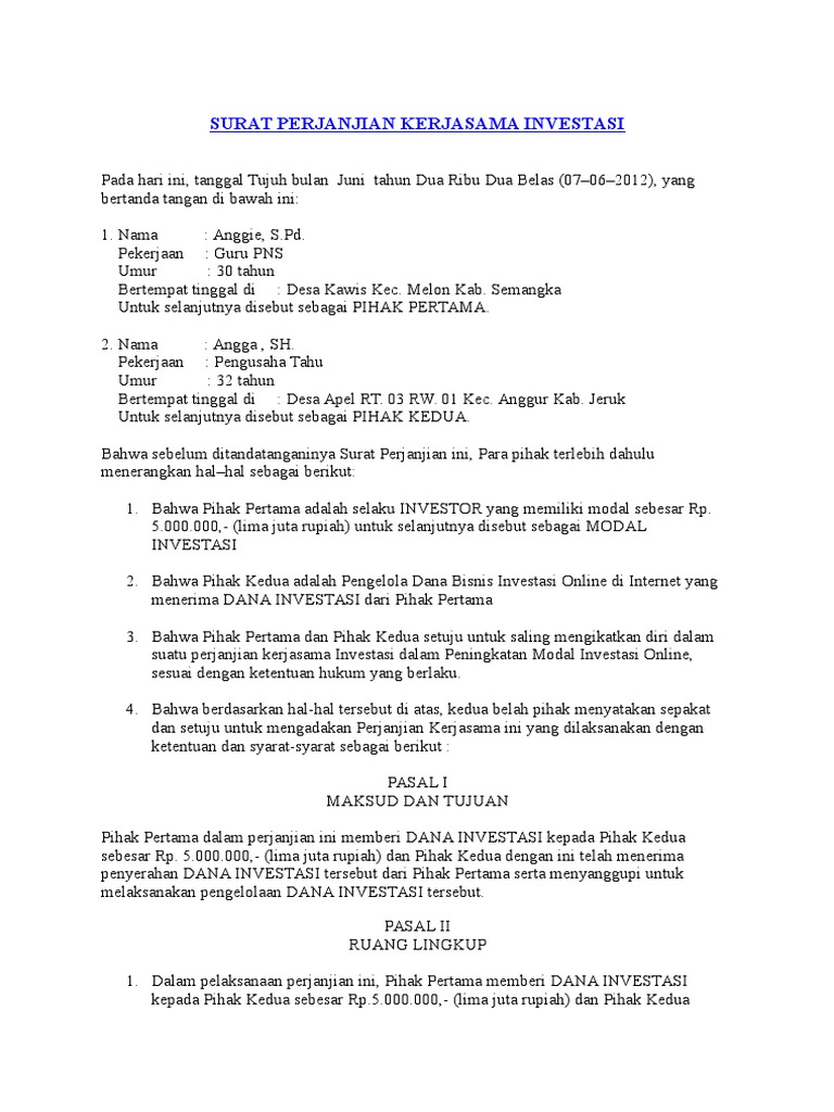 Contoh Surat Perjanjian Kerjasama Investasi - Content Contoh surat perjanjian kerjasama investasi modal usaha ini digunakan sebagai keterangan dan pengikat dua belah pihak yang melakukan kerjasama. Contoh surat perjanjian kerjasama investasi. Surat kontrak ini memiliki kekuatan hukum apabila dikemudian hari terjadi penyalahgunaan kontrak dengan sanksi seperti yang termuat dalam surat ini.