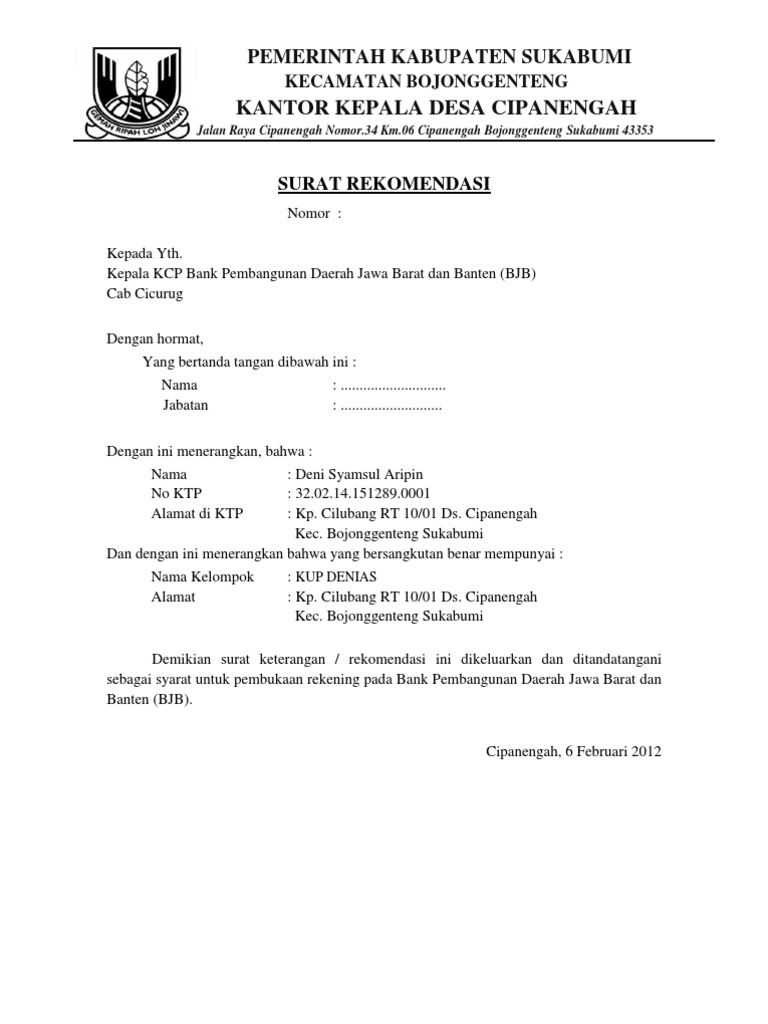 Contoh surat referensi bank untuk pembukaan rekening. idmanajemen.com › surat-keterangan-kerjaDownload Contoh Surat Keterangan Kerja Untuk ... - ID Manajemen Sep 09, 2019 · Demikian Surat Keterangan Kerja ini dibuat dan ditandatangani sebagai syarat untuk pembukaan rekening Bank {Nama Bank}. {Nama kota}, {Tanggal surat dibuat} ({Nama pejabat penanda tangan}) {Jabatan} Contoh 2 : No. : {Nomor surat} Hal : Surat Keterangan Kerja guna pembukaan rekening bank Lamp. : – Dengan hormat, Contoh Surat Permohonan Pembukaan Rekening Giro Bjb ... Calon pemegang rekening harus mengisi kartu contoh tanda tangan. contoh surat permohonan pembukaan rekening. surat referensi perusahaan untuk pembukaan rekening bank. Darmawati bakal gantikan orang tuanya berangkat ke tanah suci tribun timur. Draft surat keterangan bank bjb 2 docx nomor 0710 spkb vii. Surat Permohonan Pembukaan Rekening Giro Perusahaan Surat referensi perusahaan untuk pembukaan rekening bank. Contoh surat permohonan pembukaan rekening giro oleh perusahaan. Contoh surat permohonan pembukaan rekening giro surat 27. Pembukaan rekening baru /new account opening perubahan data/data changes. Apabila telah diperjanjikan dalam perjanjian pembukaan rekening. Contoh Nomor Rekening Bank Bjb Contoh surat permohonan cetak rekening koran ke bank bjb. 1 bendel kepada yth, pt. Begitu pun halnya saat mau transfer di atm ke bjb syariah dengan nomor rekening 987654321, yang harus anda ketik adalah 425 987654321. Biasanya, petugas keamanan akan segera memberikan nomor antrian cs. Tidak termasuk dalam daftar hitam bank indonesia;