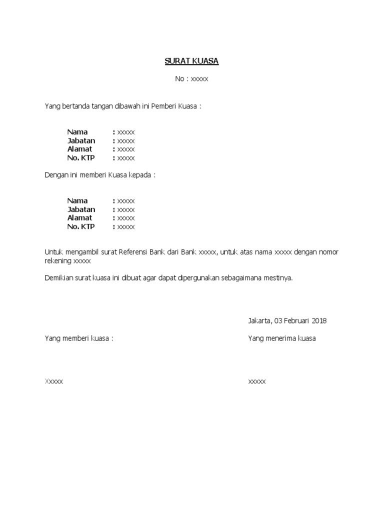 › blog › indonesia7 Contoh Surat Kuasa Bank dan Cara Membuatnya Jan 20, 2022 · Contoh Surat Kuasa Bank Mega Tidak sebatas mengambil uang, dalam surat kuasa kamu juga bisa mencantumkan beberapa tujuan yang ingin dilimpahkan. Misalnya untuk mengecek saldo rekening, cetak rekening koran , pembukaan rekening, dan sebagainya.
