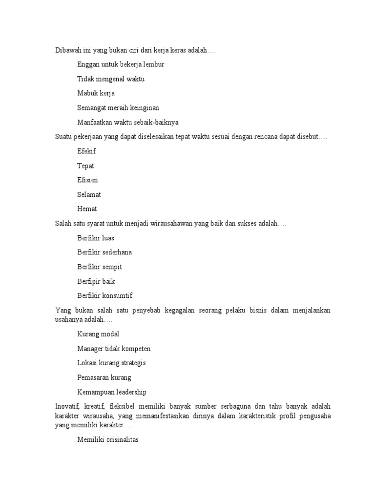 PTS KEWIRAUSAHAAN - SMA PMS 2 BATANG | Other Quiz - Quizizz Yang bukan salah satu penyebab gagalnya seorang pelaku bisnis dalam menjalankan usaha adalah…. answer choices . Kurang modal. Manager tidak kompeten ... Yang bukan salah satu alasan kegagalan pebisnis saat menjalankan bisnis adalah... answer choices . Kekurangan modal.